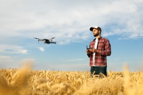 Compact drone hovers in front of farmer with remote controller in his hands. Quadcopter flies near pilot. Agronomist taking aerial photos and videos in a wheat field