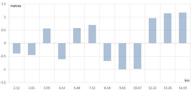 As expected, the computed elevations were much better at the first few measuring stations, which were nearest the base station, than the elevations determined at the remainder of the route. The errors tended to increase as the rover moved away from the base until, at measuring station 12, a maximum was reached. To give an idea of the accuracy achieved, the differences between the nominal elevations and the computed ones can be seen in the figure below. Readings of pressure, temperature, time and percentage of humidity (for monitoring purposes only) were carried out using the rover instrument and were synchronised with the base readings taken at intervals of 5 minutes. All subsequent computations followed the same process as per the previous example.